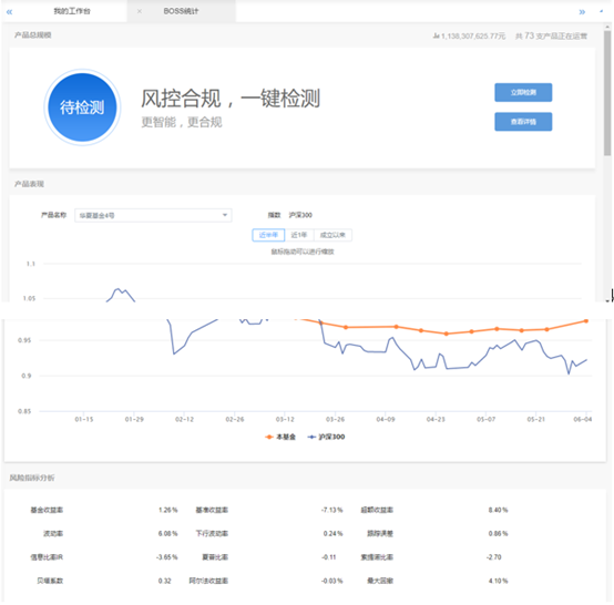 • BOSS統(tǒng)計:專門針對領導層設計的產(chǎn)品總規(guī)模、產(chǎn)品表現(xiàn)、風險指標分析檢測頁面。